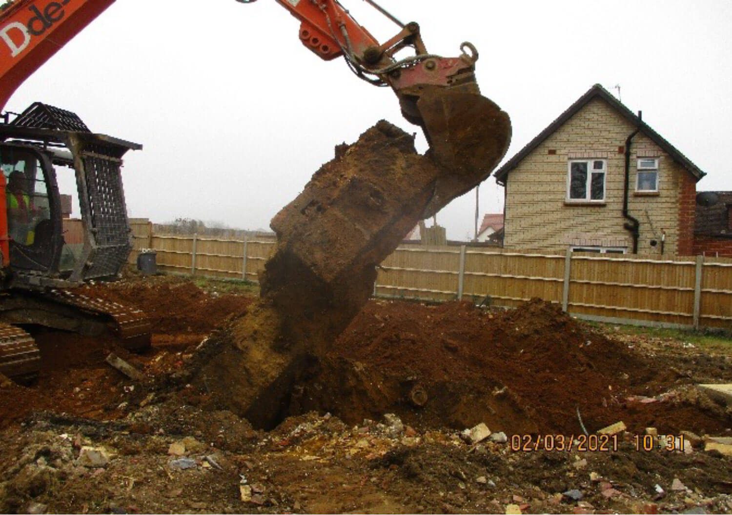During the breaking out of concrete paths around the houses, we uncovered asbestos in the form of shuttering to the underside of the concrete slabs. Works were immediately stopped pending sampling and testing. The laboratory report confirmed the presence of asbestos cement. The contaminated concrete and hardcore underneath were removed from site.
